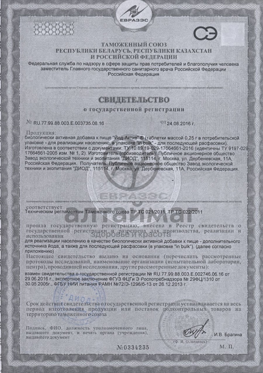 При приеме Йод-Актива необходимо учитывать, что, по данным Российских исследований, поступление йода с пищей составляет 40 мкг в день.