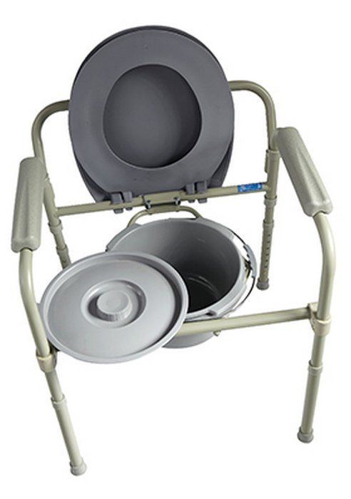 Кресло-туалет 3 в 1 (может применяться как кресло-туалет, поручень для унитаза и насадка на унитаз). Съемное ведро с крышкой, регулируемая высота сиденья (42,5-55 см), регулируемые по высоте ножки с противоскользящими резиновыми наконечниками (шаг регулировки высоты 2,5 см), расстояние между поручнями - 46,5см, габариты - 53,5х40,5х83 см, максимальная нагрузка - 115кг, вес изделия - 6,5 кг.