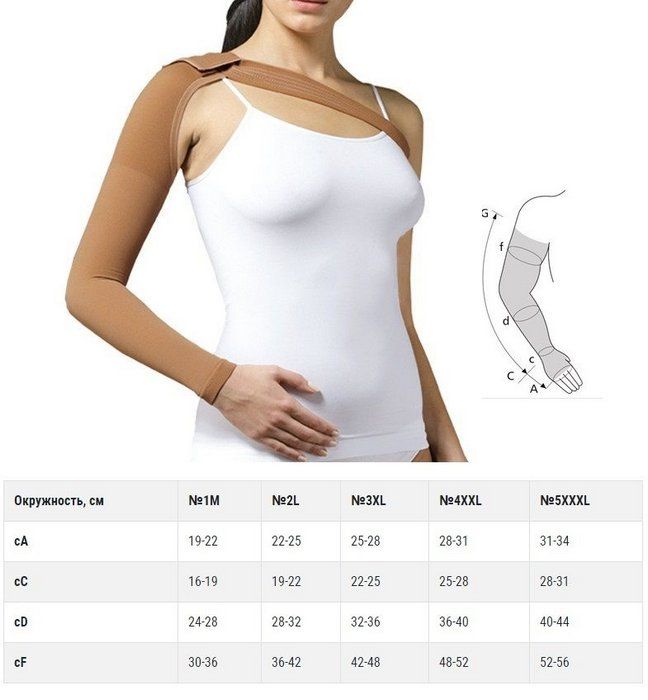 - Компрессионный рукав имеет длину от запястия до подмышечной впадины, сверху заходит на плечо.