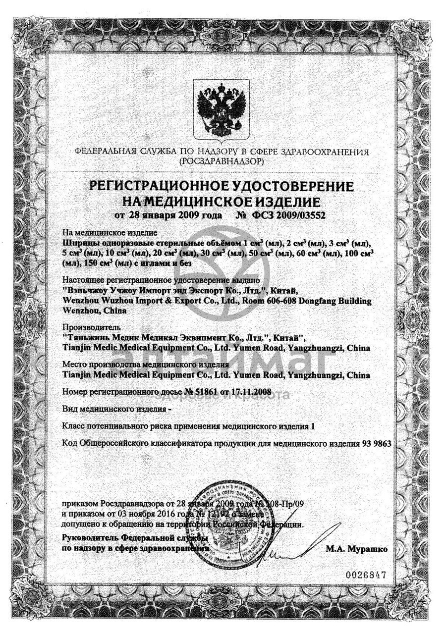 Шприц трехкомпонентный с резиновой уплотнительной манжетой на поршне, изготовлен из специальной медицинской марки PP. Для плавности хода поршня и мягкости введения растворов применен силиконовый впрыск. Игла надета на шприц, является съемной. Имеет трёхгранную лазерную заточку и произведена из специальной марки нержавеющей стали, покрыта и внешне и внутренне слоем специализированного силикона.