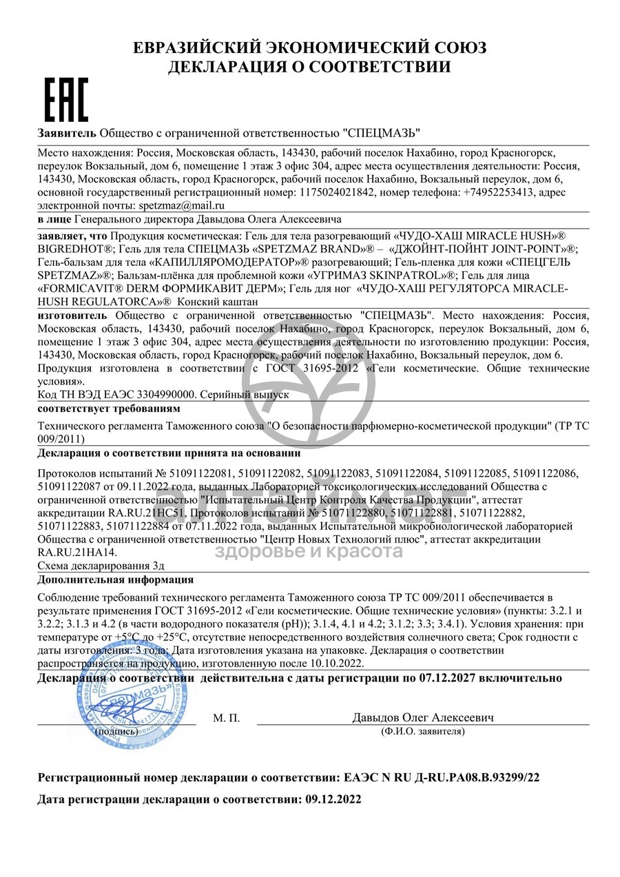 Косметическое средство для растирания в обрасти суставов и позвоночника; средство при болях и воспалениях суставов и околосуставных волокон, мышц и связок; содержит оптимально подобранный комплекс из масла сибирской пихты, коллаген-эластина, калия, экстрактов лекарственных растений; является источником хондроитина и глюкозамина; муравьиный спирт, входящий в состав, активирует обменные процессы, быстро проникает в глубинные слои дермы, стимулируя активное восстановление поврежденных и старых клеток и обеспечивая их полезными микроэлементами.